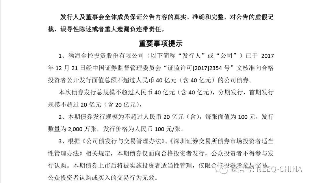 由海南省慈航公益基金会为实际控制人、海航资本集团有限公司为控股股东的渤海金控(000415)前日连发5条公告,公告称,“渤海金控投资股份有限公司(以下简称“发行人”或“公司”)面向合格投资者公开发行面值不超过 40 亿元的公司债券已获得中国证券监督管理委员会 “证监许可[2017]【2354】号”文核准。”